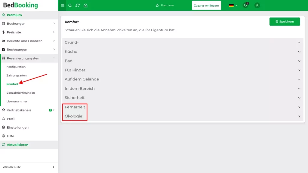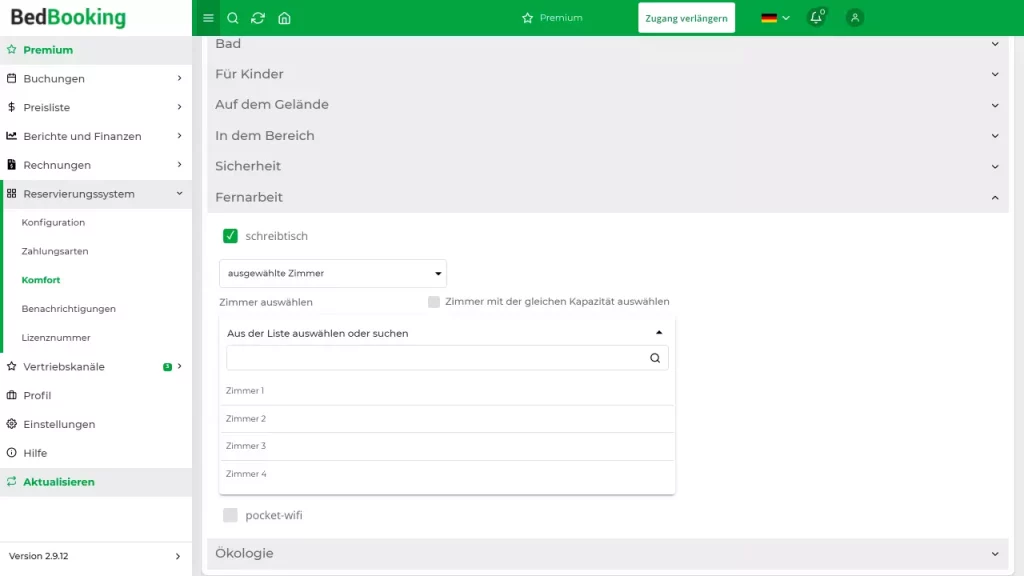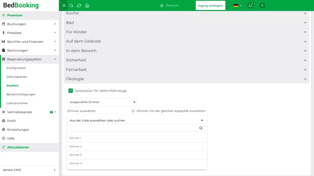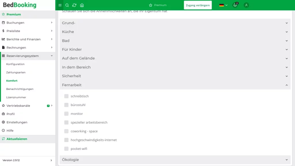 Die Einrichtung von Annehmlichkeiten im BedBooking-Reservierungssystem ist einfach und intuitiv. Gehen Sie einfach zum Hauptmenü, wählen Sie „Reservierungssystem“ und klicken Sie auf „Annehmlichkeiten“. Dort finden Sie verschiedene Kategorien wie: