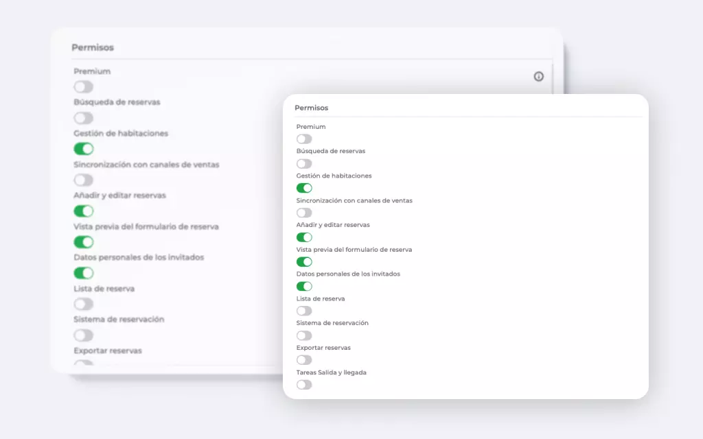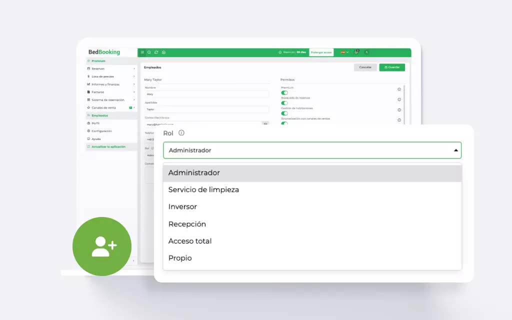 Puedes configurar todos los permisos de forma independiente o utilizar roles predefinidos, establecidos por BedBooking. Depende de ti decidir qué datos compartir con tus empleados o empresas externas.
