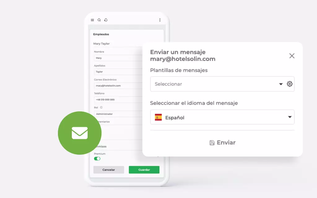 Mensajería directa a nuestros empleados añadidos en el sistema. Sí, es posible. Puedes contactar fácilmente con tus empleados directamente desde la aplicación BedBooking. Envías mensajes a los empleados a través de la función SMS de tu teléfono o correo electrónico configurado con tu bandeja de entrada de correo electrónico. Agilizas el trabajo contactando directamente con tus empleados o empresas colaboradoras. No es necesario que tengas los números de teléfono de todos los empleados en tu teléfono, sino que tienes la opción de enviar mensajes directamente desde BedBooking.