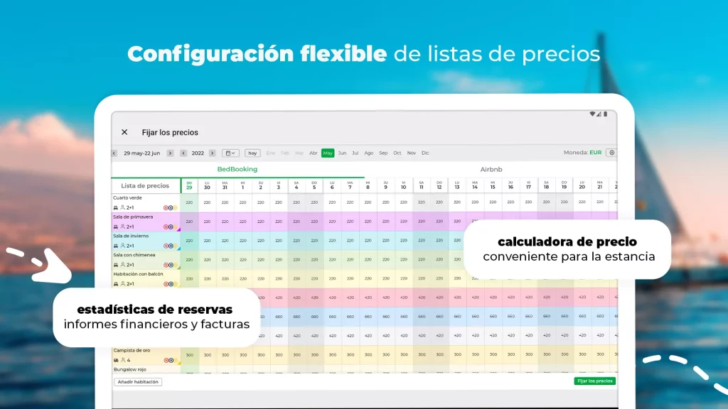 La aplicación de calendario de reservas ayuda a gestionar el establecimiento de alojamiento. Establezca listas de precios para el día seleccionado de la semana, temporada u ocasiones especiales.