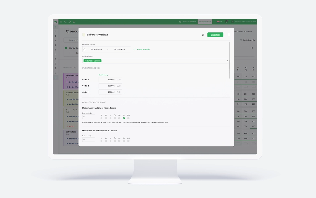 Još jedna korisna funkcija u upravljanju cjenikom je mogućnost postavljanja ograničenja dostupnosti. Na primjer, možete postaviti minimalnu dužinu boravka ili onemogućiti dolazak na određene dane. Personalizacija cijena i omogućavanje ograničenja dostupnosti dodaju dodatna polja u prozor za uređivanje cijena, omogućujući jednostavno postavljanje cijena i ograničenja dostupnosti za specifične sobe i datume.