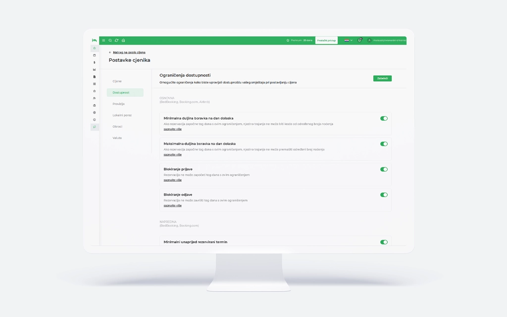 U novom cjeniku možete postaviti uvjete poput minimalne dužine boravka, vremenskih okvira za last minute rezervacije i ograničenja za dane dolaska i odlaska. Na taj način imate potpunu kontrolu nad dostupnošću svog objekta ovisno o sezoni, potražnji ili odabranoj marketinškoj strategiji.