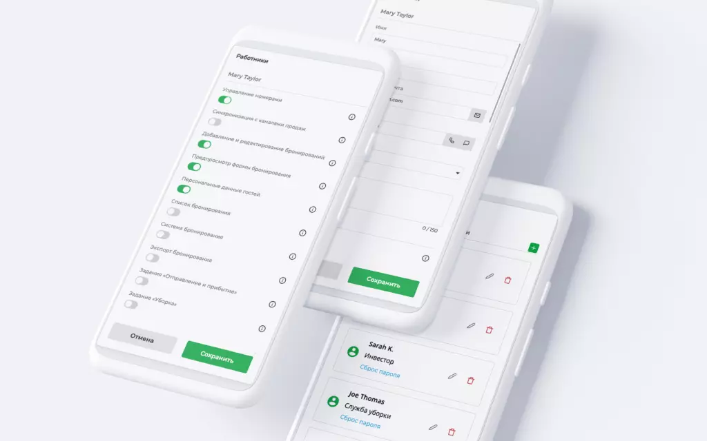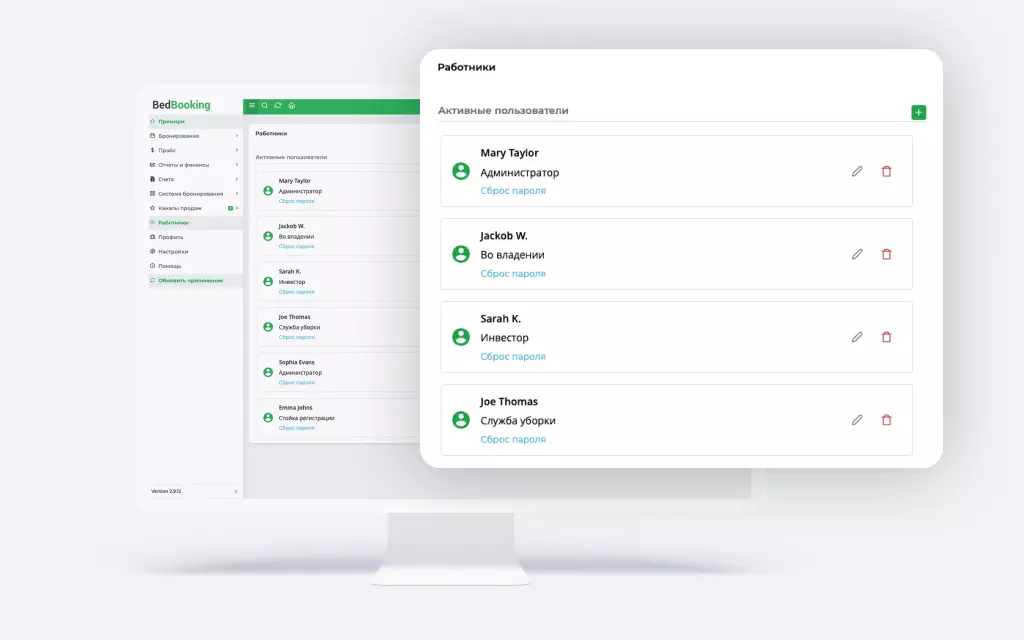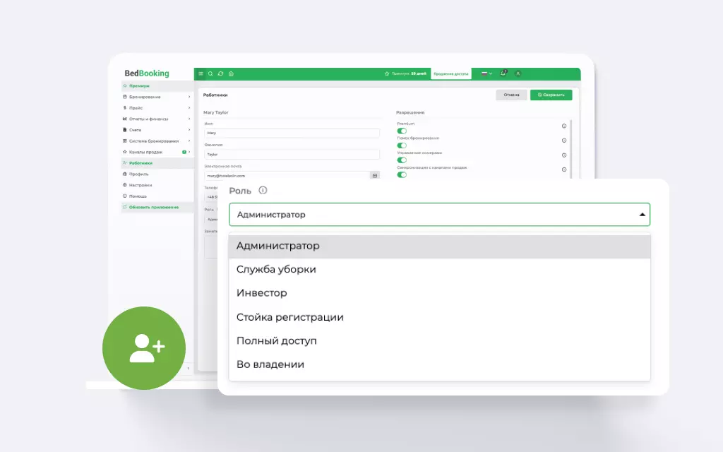 Вы можете нанять собственных сотрудников или сотрудничать с внешней компанией. Используя единое приложение BedBooking, вы можете распределить конфиденциальные данные, доступные всем, или определить границы доступа для каждого конкретного сотрудника.