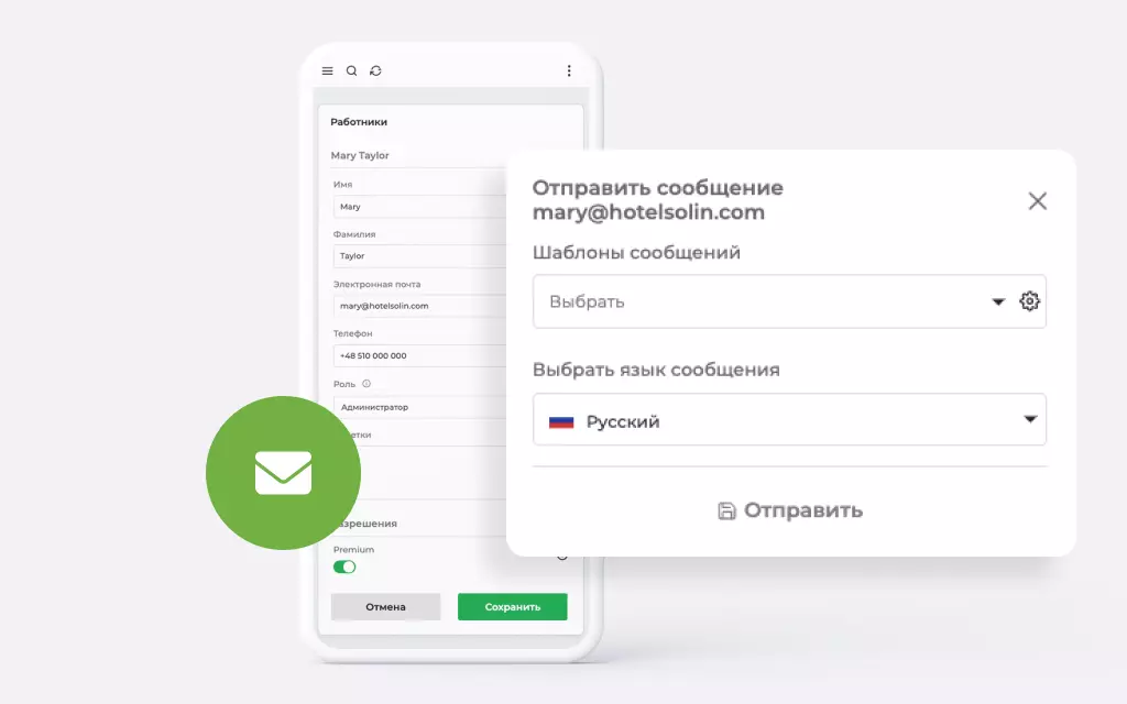 Прямая рассылка сообщений добавленным в систему сотрудникам. Да, это возможно. Вы можете легко связаться со своими сотрудниками прямо из приложения BedBooking. Вы отправляете сообщения сотрудникам с помощью функции SMS на телефоне или электронной почты, настроенной на ваш почтовый ящик. Вы оптимизируете работу, напрямую связываясь со своими сотрудниками или сотрудничающими компаниями. Вам не обязательно иметь в своем телефоне номера телефонов всех сотрудников, но у вас есть возможность отправлять сообщения непосредственно из BedBooking.