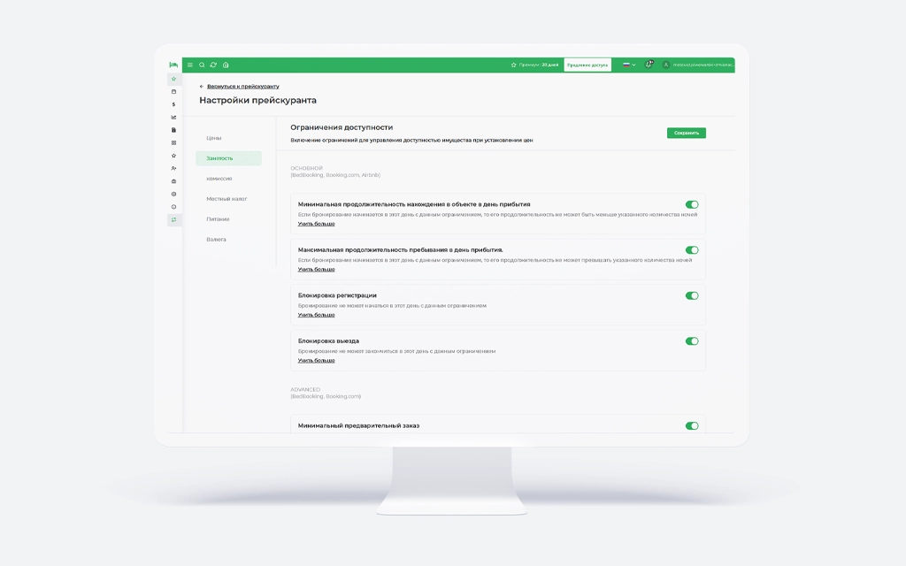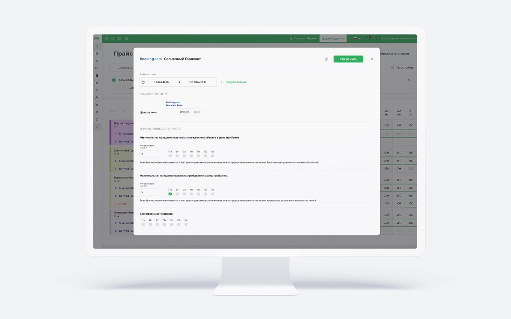 Еще одна полезная функция в управлении прайс-листом — это возможность задать ограничения доступности. Например, вы можете установить минимальный срок пребывания или исключить заезд в определенные дни. Персонализация цен и активация ограничений доступности добавляют дополнительные поля в окно редактирования цен, позволяя легко настраивать цены и ограничения для конкретных номеров и периодов.