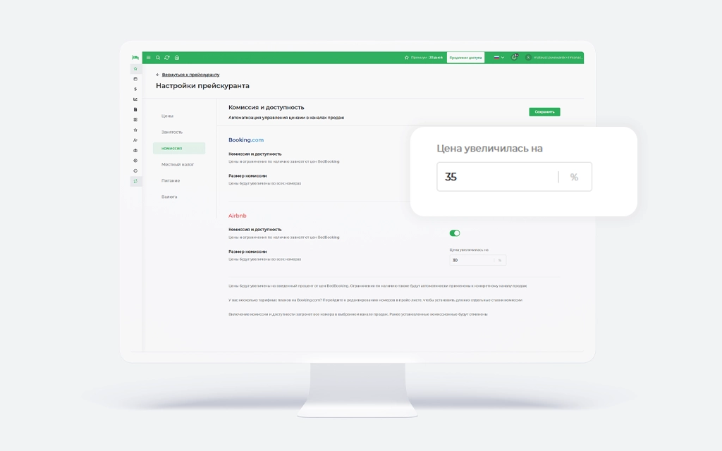Для пользователей, которые не хотят вручную настраивать цены для каждого канала, мы внедрили функцию «Комиссия и доступность». Эта функция позволяет автоматически увеличивать цены на Booking.com и Airbnb на определенный процент или сумму относительно цен в BedBooking. Это простое средство, которое позволяет вам легко настроить цены для различных платформ, не нужно вносить изменения вручную.